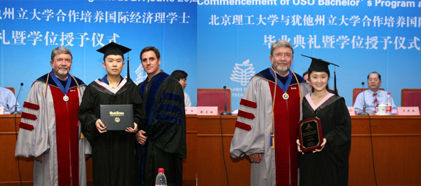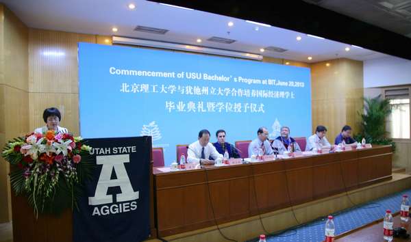 2013年6月20日下午,国际教育合作学院在理工国际教育交流大厦报告厅隆重举行了beat365英国官方网站与犹他州立大学合作办学项目第七届学生毕业典礼。出席毕业典礼的有犹他州立大学Jon Hunstman商学院副院长Frank Caliendo博士、中国项目主任Dwight Israelsen博士,beat365英国官方网站国际交流合作处处长王庆林教授、国际教育合作学院院长梅文博教授、罗佳书记、明道福副院长、蒋志湘副院长、学院部分教职工、全体毕业生、部分学生家长以及犹他州立大学来京访学的学生代表团。典礼由蒋志湘副院长主持。