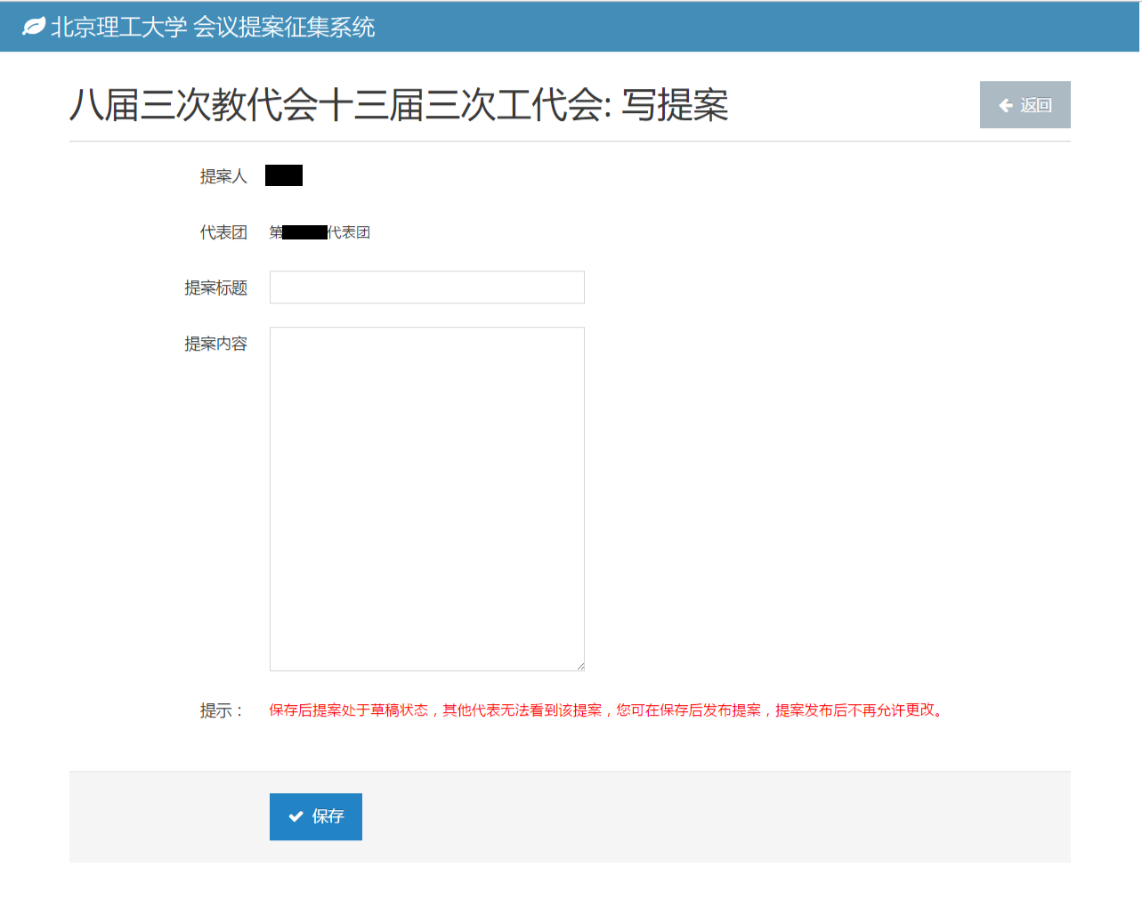 点击“写提案”后,代表基本信息将自动填入相应位置,代表按相应要求完善提案标题和内容后,便可“保存”。注意,此时该提案为草稿状态,尚未发布,代表可进一步修改并完善提案内容,同时其他代表将无法通过提案列表查看该提案。