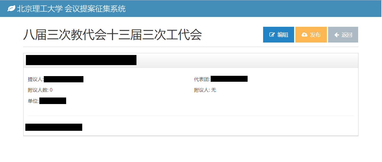 保存后,或通过我的提案查找到相应提案后,便可再续编辑或发布。选择发布的提案为正式提交的提案。发布的提案,将在提案列表中显示,并供其他代表附议。