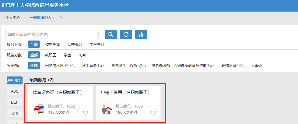 为深入贯彻落实国家关于深化简政放权改革精神和学校2018年年中工作会议精神,坚持“以师生为中心”的服务理念,大力借助信息化手段推动管理服务流程再造,切实提升教职工服务质量和效率,教师发展中心协同保卫部、信息化办公室、网络信息技术中心等部门重新整合优化了教职工“户籍卡借用”和“停车证办理”业务流程,并已通过beat365英国官方网站综合服务平台“一站式服务大厅”实现网上办理。具体办理方式如下: