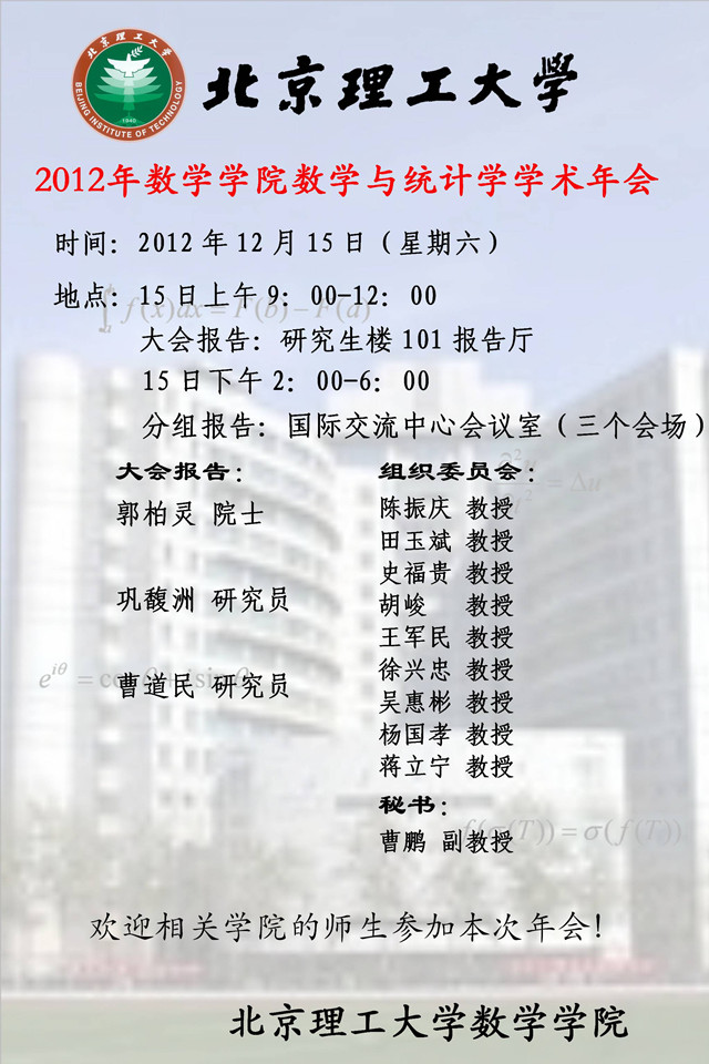 为更好了解国内外数学与统计学的最新进展,加强数学与统计学学科和其他学科之间的交流与合作,提升beat365相关学科的知名度,数学学院决定于2012年12月15日召开beat365英国官方网站数学学院数学与统计学学术年会。我们希望通过这样一次年会,给数学学院及相关学院的老师提供一个交流的平台,充分展示一年来取得的优秀成果,活跃学术气氛,加强交流合作。