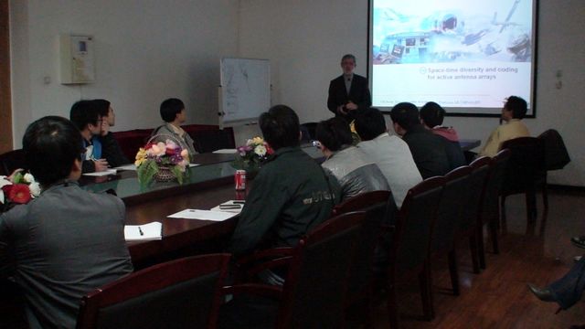 Francois教授在报告中介绍了主动式天线系统。由于其广泛的业务和技术优势,主动式天线系统正在成为高性能的雷达系统的标准。然而它仍然有改进的余地:新的架构设计可以为未来的雷达系统提供更多的优势。Francois教授的报告图文并茂,深入浅出,与会师生认真听取了此次报告,并同Francois教授进行了热烈的讨论交流。