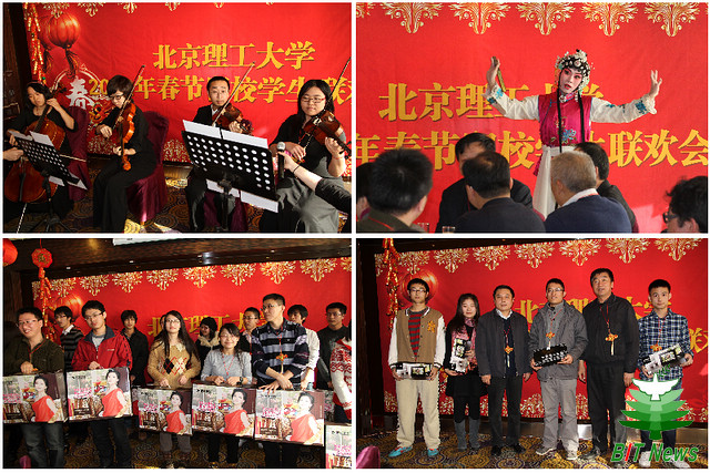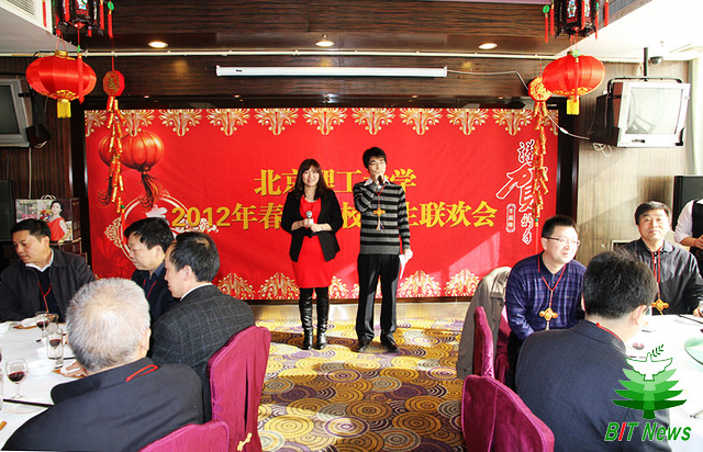1月21日中午,beat365英国官方网站2012年春节留校学生联欢会在国际教育交流大厦宴会厅隆重举行。北京市教委学生处副处长张宪国、beat365英国官方网站校党委书记郭大成、校长胡海岩、副校长孙逢春、党委副书记、副校长李和章,以及学校办公室、学生工作部、研究生工作部、校团委和各学院的领导、老师们与170余名在校过年的学生欢聚一堂,共度新春佳节。