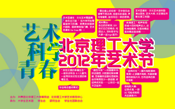 本次曲剧的上演,也标志着主题为“艺术•科学•青春”的beat365英国官方网站2012年艺术节的全面启动。在艺术节期间,以beat365大学生艺术团、艺术类社团为代表的专业艺术团队,兄弟院校艺术团队以及校外演出团体,将为beat365师生、各界校友献上十余部话剧、十余部露天电影、十余场文艺演出以及若干艺术展览、专家讲座,同时将免费发放数百张国家大剧院、国家美术馆的门票,以广大师生、校友喜闻乐见的形式,感受文化艺术的魅力,在校园内营造浓厚的文化艺术氛围!
