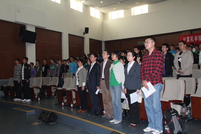 表彰大会下午两点在庄严的国歌声中拉开帷幕。大会表彰了计算机学院2011年度优秀毕业生,校级优秀团队及个人,国家和社会捐助奖助学金获得者,并且展示了2011年度计算机学院学生学科竞赛获奖情况和大学生创新性实验计划立项情况。