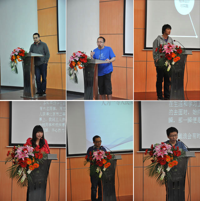 随后,由获奖的学生代表依次登台发言,他们是优秀学生代表原九歌新闻社社长王亚珅,北京市优秀班集体07110904班班长焦晨宇,信息安全大赛一等奖获奖代表李龙一佳,自强典范郭伟,基础教育学院优良学风班代表张舒雯以及刚刚毕业的社会捐助奖学金获获奖代表07级博士邓宁等。他们结合自己的经理分享了自己关于大学学习、生活、工作的体会和收获,讲述了自己的成长和奋斗历程,鼓励低年级的同学们自强不息,全面发展。