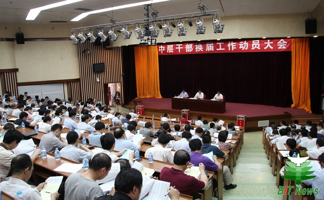 根据学校整体工作安排,学校党委决定,今年6月开始进行学校中层领导班子换届及相应处级干部选聘工作。2012年6月5日,学校在中教一层报告厅举行全校中层干部换届工作动员大会。