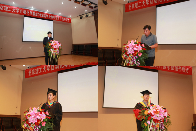 自动化学院党委书记王军政教授代表学院在典礼上致词,向圆满完成学业的全体毕业生,表示热烈的祝贺,向为同学们的成长付出了辛勤劳动的全体教职员工,表示崇高的敬意,向始终关注并支持同学们刻苦学习的各位家长亲友和社会各界人士,表示衷心的感谢。同时也对同学们提出了几点期望:志存高远,甘于奉献;勤奋努力,踏实肯干;待人诚恳,乐于助人;吃苦在前,享受在后;言行一致,诚信做人。最后希望同学们在展翅高飞的同时,能常回家看看,共同分享成功的喜悦、共同分担失败的挫折。