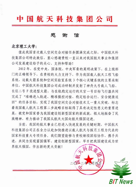 中国航天科技集团公司致信感谢北理工对我国航天事业的支持和贡献