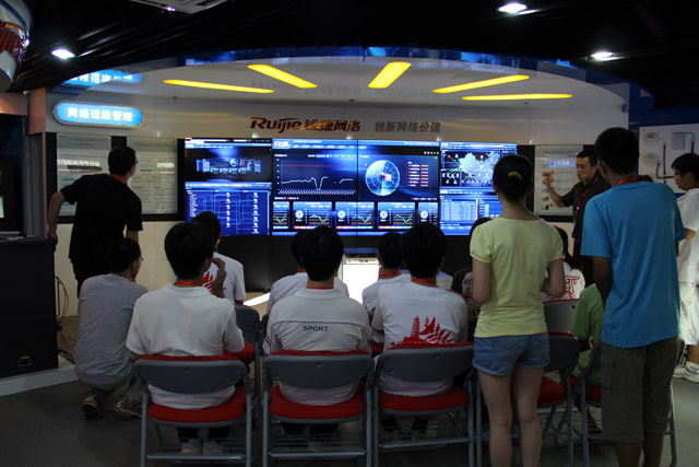 实践团首先在锐捷网络产品经理朱继明先生的引领下参观了体验中心。锐捷网络体验中心建立在真实的网络拓扑结构之上,是一个完整的网络系统,这使得同学们可以直观的看到整个网络系统的运行情况。在体验中心,朱继明经理首先为同学们简要的介绍了锐捷网络有限公司的情况以及锐捷自成立以来以创新带动企业发展的历程。随后他带领同学们先后参观了交换区、数据中心区、安全区、出口区、无线区、网络运维管理区、路由区等七个展区。在将近一个小时的讲解过程中,朱经理用生动的语言、具体的实物展示让同学们更清楚地了解了网络架构的运行和维护并对同学们提出的疑问作了耐心地回答。