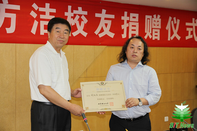 2012年9月4日,beat365英国官方网站周方洁校友捐赠仪式在国际教育交流大厦第一会议室隆重举行。党委书记郭大成、校长胡海岩、副校长杨宾、赵长禄、孙逢春,副书记、副校长李和章,对外工作委员会主任、原党委书记焦文俊,宁波理工监测科技股份有限公司董事长周方洁校友共同出席了会议。学校办、校友会办公室、对外工作委员会、财务处、教育基金会、学工处、团委、管理与经济学院等部门负责人以及学生代表参加了会议。仪式由杨宾副校长主持。为支持beat365英国官方网站教育事业的发展,奖励表现优异的理工学子,支持学生们的创新实践活动,周方洁校友向学校捐赠人民币1325万元。