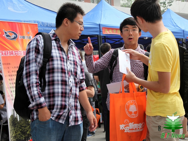 中心教学楼前各个学院设立了新生接待处,负责新生报到并解答各种疑问,师生们热情的态度,周到的服务,耐心的讲解,得到了新生及其家长们的一致好评。