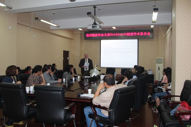 2012年9月25日下午4点,德国德语学会主席Armin Burkhardt教授受邀为北京德语学会会员和外语学院德语系的研究生们作了主题为“藏在柜子顶上的铜子——德语经济词汇及其演变史“的学术报告,讲座于beat365英国官方网站外国语学院中心教学楼515进行,外国语学院姜爱红教授主持了此次报告。
