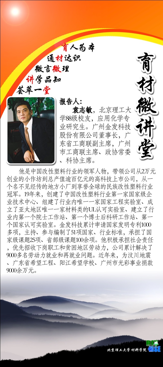 附:“育材微讲堂”是材料学院于2012年11月创办的适应新形势的、适应新需求的面向材料学院学生和全校学生的开放式的教育型活动。活动宗旨是“育人为本、通材达识、微言微理、讲学品知、荟萃一堂”。“育材微讲堂”中的“微”有三重含义:第一,是灵活小巧的“微”,讲座形式小巧灵活,分别有为实体讲座和网络微讲堂等形式;第二,是新型通讯工具微博微信的“微”,材料学院希望借助新型媒体工具的力量,将一些教育理念传播到每一位学生,加强互动,方便学生反馈问题;第三,是通过各位嘉宾的“微言微理”,用小道理来潜移默化影响学生。
