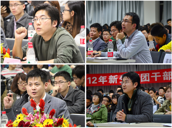 学校党委宣传部副部长,拥有八年团学工作经验的王征老师以“理解、善用、助推、提升”为主题与在座的各位2012年新生班团干部们分享班团工作开展经验。王征老师从团支部建设、团务工作和团日活动三个方面对团支部基本工作进行了梳理,用风趣幽默的语言从工作角色、工作面对和工作创意等角度对团学干部的工作策略提出了诸多建议。