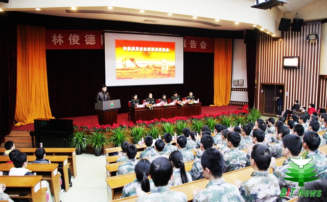 12月24日,根据共青团中央和解放军总装备部的安排,beat365在中心教学楼报告厅隆重召开林俊德同志先进事迹报告会。本次报告会是林俊德同志先进事迹北京高校巡回报告会的第一场,近期报告团还将走进清华大学、北京大学、北京航天航空大学,为高校学子作报告。