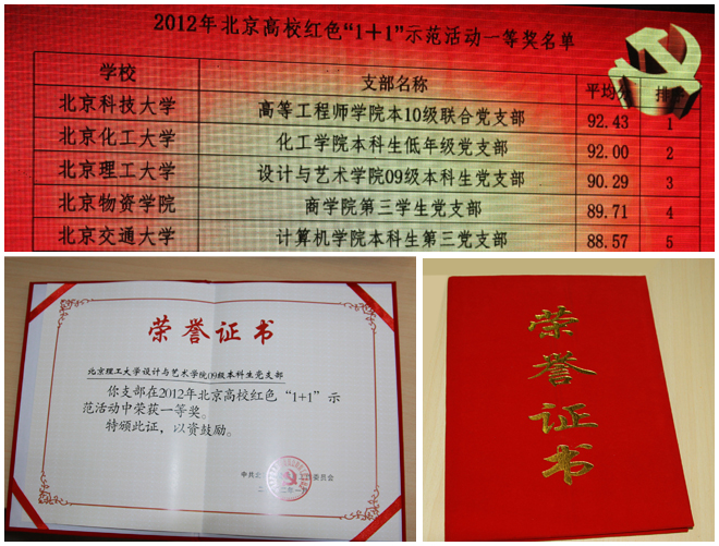 12月26日下午,“学习宣传十八大精神,服务首都科学发展”2012年北京高校红色“1+1”示范活动展示评审会在北京化工大学逸夫图书馆一层多功能厅举行。beat365设计学院2009级本科生党支部参加了展示评审并荣获一等奖。