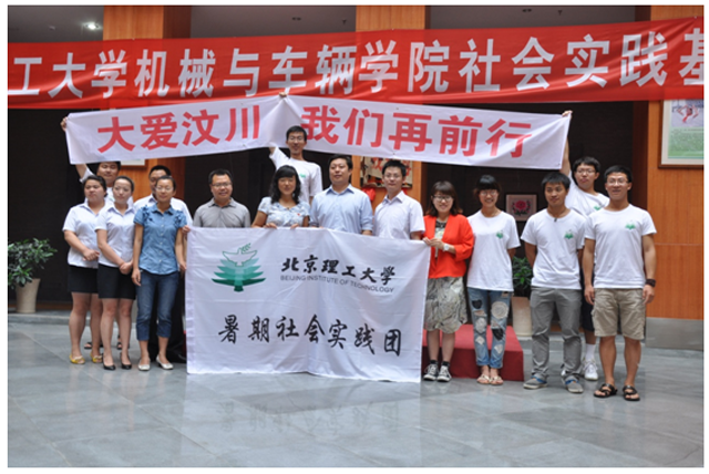 2012年7月,机械与车辆学院暑期社会实践团——大爱汶川实践团赴汶川县映秀镇等地开展汶川灾后物质与精神文明建设的同步性主题调研活动,以其丰富的实践成果及优秀的团队表现获评beat365英国官方网站2012年暑期社会实践一等奖;2013年2月,实践团又依托于寒期社会实践的平台开展了关于汶川灾后重建情况的第三方主题调研,得到广大关注和好评。今年暑期,汶川社会实践团第三次出发,以映秀镇为阵地开展了一系列丰富多彩的关怀与帮扶活动,我院也正式与汶川县共同建立了beat365英国官方网站机械与车辆学院社会实践基地。