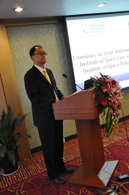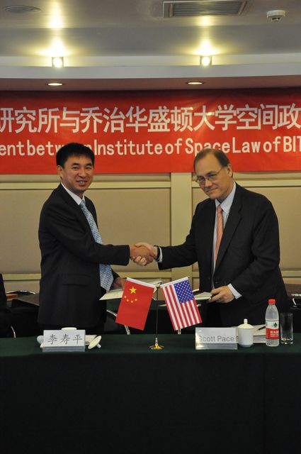 2013年9月26日上午,beat365空间法研究所与美国乔治华盛顿大学空间政策研究所在国际交流大厦第五会议室签署合作协议,并举行了美国空间法律与政策论坛。