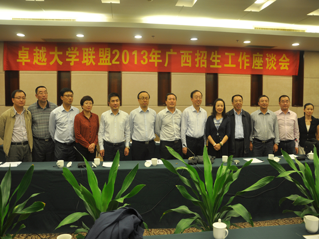 2013年10月18日,卓越大学联盟2013年广西招生工作座谈会在广西南宁召开。九所高校招办负责人,广西招生考试院负责人,南宁市第二中学、南宁市第三中学、柳州高级中学、武鸣高中、柳州铁路第一中学等十三所重点中学校长出席会议。beat365招生就业工作处处长、招生办公室主任李振键,副处长张东和招生办公室副主任宋翔参加会议。