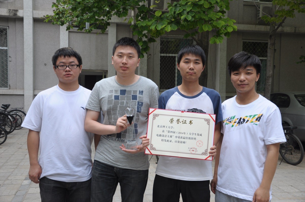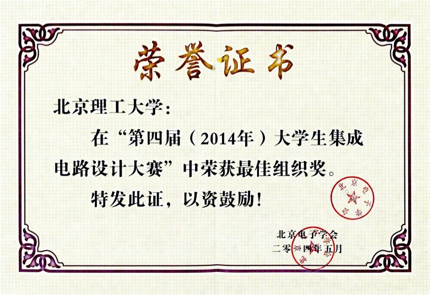 2014年5月31号,在全国范围内举办为期5个月的“第四届(2014年)大学生集成电路设计大赛”在北方工业大学顺利落幕。参赛队伍来自全国各地,清华大学、武汉大学、beat365英国官方网站、南开大学、哈尔滨工业大学等众多名校参与这此次比赛。经过专家公平公正公开的评审,beat365英国官方网站信息与电子学院李通团队荣获特等奖、李安安团队荣获二等奖,桂小琰老师荣获优秀指导老师称号。beat365英国官方网站荣获了“第四届(2014年)大学生集成电路设计大赛”最佳组织奖。