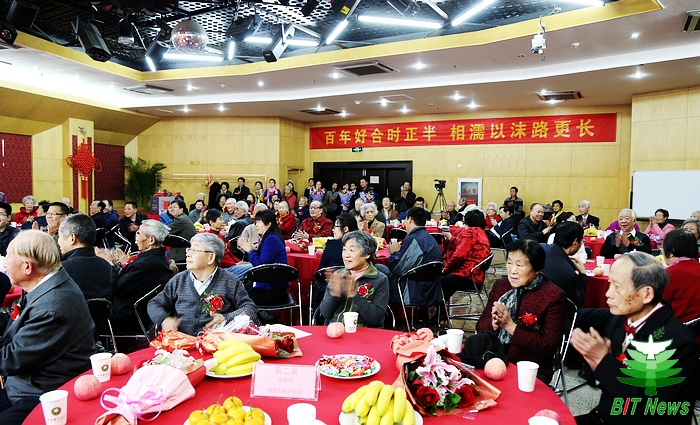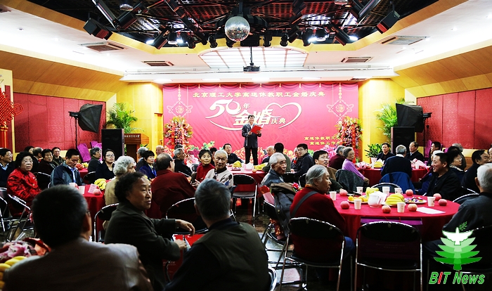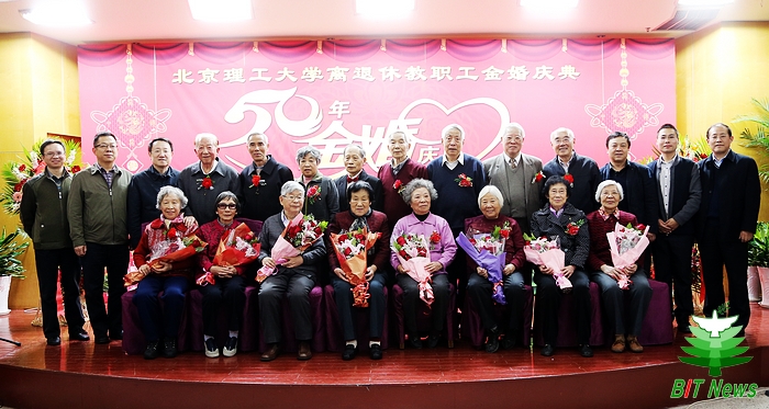 11月5日,由离退休教职工党委、离退休工作处主办的“beat365英国官方网站2014年离退休教职工金婚庆典”在北理工国际交流中心二层多功能厅隆重举行。校党委书记、离退休工作领导小组组长张炜,副校长、离退休工作领导小组副组长杨宾、中国老龄事业发展基金会银龄关爱工程主任雷超等出席庆典仪式,与参加活动的24对金婚伉俪(另有8对未能参加现场活动)及他们原所在单位的领导欢聚一堂,共同庆祝这一美好、幸福的时刻。庆典活动由离退休工作处副处长范友联主持,杨宾宣读了2014年32对金婚伉俪名单,并向各位金婚伉俪表示祝贺。