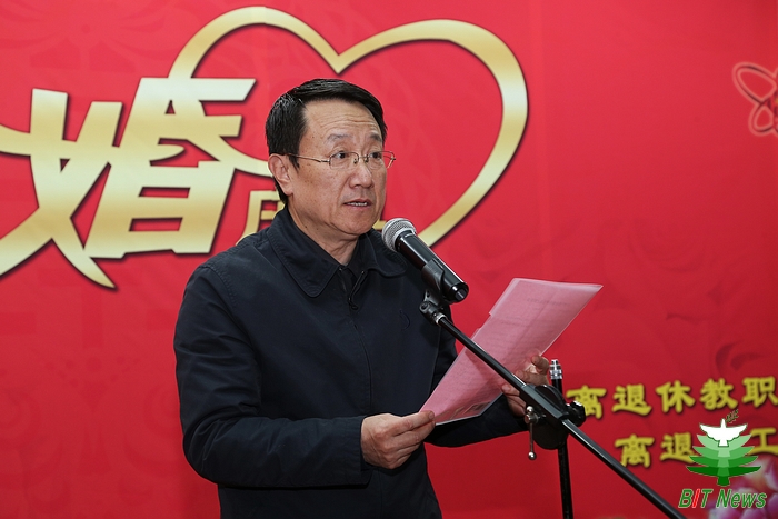 张炜致贺词,代表学校党委向全体金婚伉俪表示诚挚的祝贺!张炜高度赞扬了金婚伉俪们在50年里互敬互爱,共同追逐幸福人生的梦想,引领了家庭和睦、代际和顺、社会和谐的良好风尚,不仅是家庭的幸福,更是和谐社会的福祉,也是大家学习的榜样。他指出,老同志们是学校建设发展的功臣,怀着对党的教育事业的无限忠诚,投身于学校各项工作,为学校快速科学发展贡献了毕生的心血和精力,离退休后仍以老骥伏枥志在千里的豪情老有所为,为学校的发展建言献策。他希望金婚伉俪们能够进一步发挥典型示范的作用,为构建美好、和谐的校园贡献力量,希望老同志们一如既往的关注和支持学校的工作,欢迎老同志们继续为学校发展建言献策,大家共同携手创造北理工新的辉煌。张炜书记还向全校离退休教职工表达了良好的祝愿,祝老同志们身体健康、阖家幸福、万事如意!