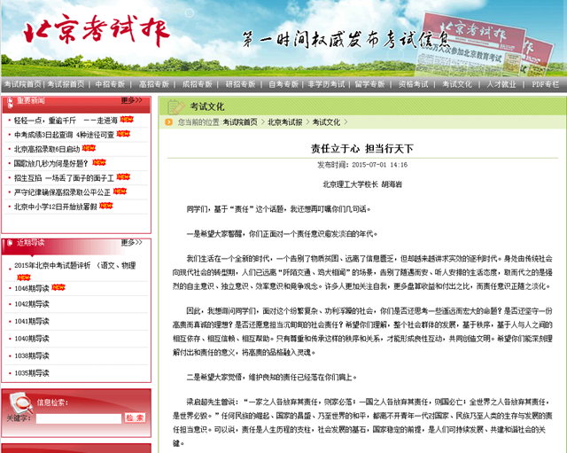 【人民网】北理工校长给毕业生的叮嘱:责任立于心 担当行天下