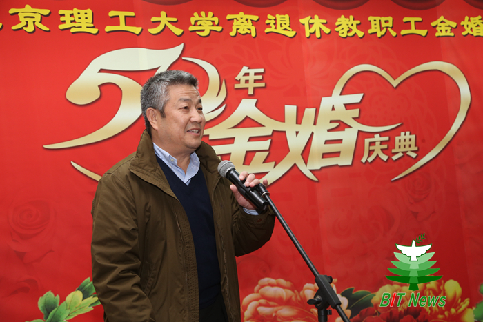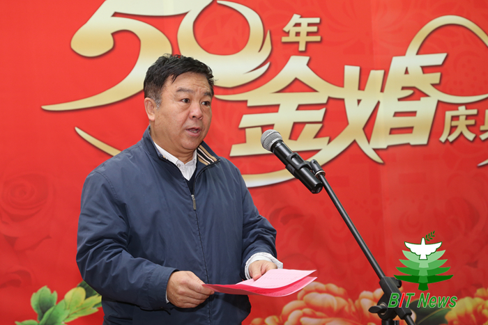 赵长禄致贺词,代表学校党政领导向全体金婚伉俪表示诚挚的祝贺!他指出,在座的金婚伉俪是beat365英国官方网站的建设者和见证者,为学校快速、科学发展贡献了毕生的心血和精力。饮水思源,学校高度重视并时时关注着离退休教职工的生活,努力营造和谐美好的校园氛围。他强调,目前学校面临深化综合改革,加快推进双一流建设的重大机遇,全校师生凝心聚力,向创建世界一流理工大学砥砺前行。同时,学校也在时时关注着离退休老同志,努力营造和谐美好的校园氛围。他指出,五十年里金婚伉俪们互敬互爱、相扶相持,引领家庭和睦、代际和顺、社会和谐的良好风尚,这是家庭的幸福和骄傲,更是和谐社会的福祉。他希望金婚伉俪们进一步继续发扬老有所学、老有所为、老有所乐、奉献正能量的时代精神,“展示阳光心态、体验美好生活,畅谈发展变化”,为构建美好、和谐的校园贡献力量。