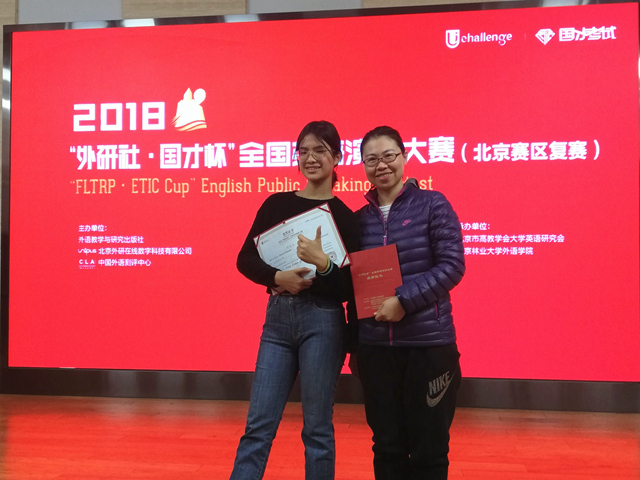 2018年11月3日,2018“外研社·国才杯”全国英语演讲大赛北京赛区的淘汰赛和决赛在北京林业大学举行。beat365英国官方网站明德书院大一新生林紫欣代表学校参战,在北理工外国语学院教师毕晓宁带领和悉心指导下,表现优异,获得北京赛区特等奖,晋级全国总决赛。
