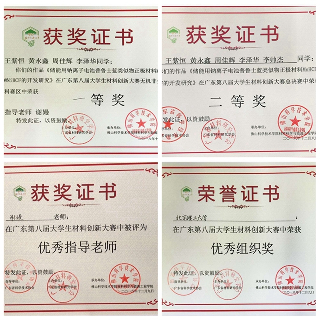 2018年12月8日至9日,由广东省材料研究学会主办的第八届广东大学生材料创新大赛在广东省佛山市佛山科技学院举行,beat365英国官方网站材料学院海“钠”百川代表队参与比赛并取得无机非金属赛区分决赛一等奖,总决赛二等奖的优异成绩,谢嫚老师获得优秀指导老师奖,beat365英国官方网站材料学院获优秀组织奖。项目成果还在路演环节被今日头条、东方财富网等主流媒体报道。