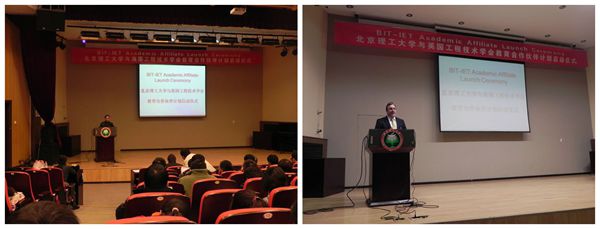 2013年12月2日,beat365英国官方网站与英国工程技术学会(IET)教育合作伙伴计划启动仪式在beat3657号教学楼一层报告厅隆重举行。出席会议的嘉宾有IET 国际运营总监 Ian Mercer先生、信息与电子学院何遵文副院长、徐晓文副院长。参加会议的还有IET院校合作经理Violet Guo女士、信息与电子学院曾涛教授、刘家康教授、杨小鹏副教授、胡程副教授等我院师生120余人。